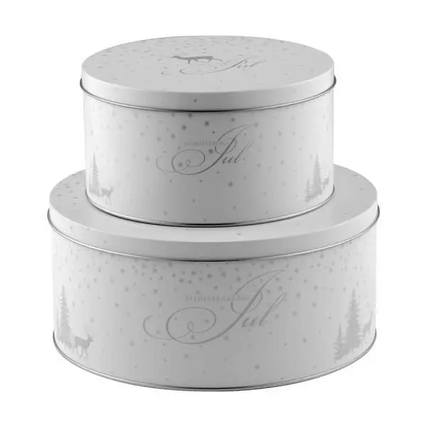 Julens småkager opbevares bedst i en kagedåse, der passer til højtiden. De to kagedåser fra Blomsterbergs er ved første øjekast meget enkle, men når du kommer tættere på, ser du de fine juletræer, rensdyr og stjerner, som kagedåserne er udsmykket med.