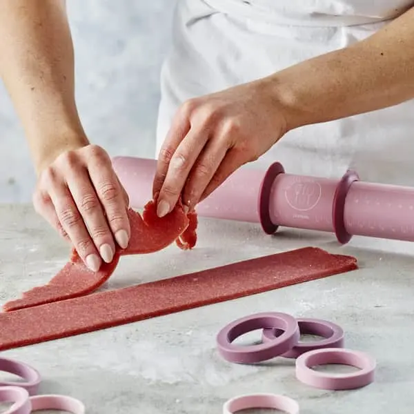 Multifunktionel kagerulle i silikone Inkl. afstandsringe og skæreringe Tåler opvaskemaskine