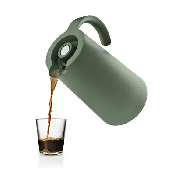 Det enkle design går igen i funktionaliteten og kvaliteten, da kanden nemt kan betjenes via en trykknap i låget. Du trykker blot en enkelt gang for at åbne, og en gang mere for at lukke – så simpelt er det. Låget drejes ligeledes nemt af og på, når kanden skal fyldes. Og så holdes kaffen varm i længere tid takket være den dobbeltvæggede vakuumeffekt.