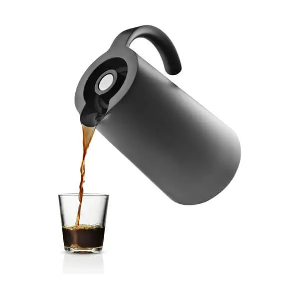 Det enkle design går igen i funktionaliteten og kvaliteten, da kanden nemt kan betjenes via en trykknap i låget. Du trykker blot en enkelt gang for at åbne, og en gang mere for at lukke – så simpelt er det. Låget drejes ligeledes nemt af og på, når kanden skal fyldes. Og så holdes kaffen varm i længere tid takket være den dobbeltvæggede vakuumeffekt.