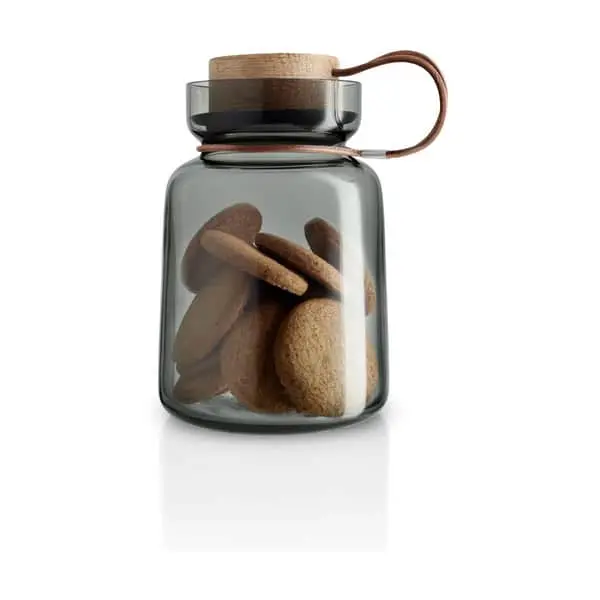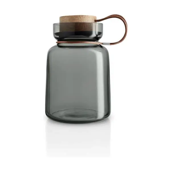 Opbevaringsglasset fra Eva Solo er god til opbevaring af alt fra rosiner til tørrede chilier. Glasser er mundblæst, og røgfarven beskytter mod sollys, så indholdets smag og farve bevares længere. Glassets låg giver nem og hurtig adgang til råvarerne og lukker helt tæt. Glasset tåler maskinopvask. Låg og læderstrop rengøres nemt med en opvredet klud.