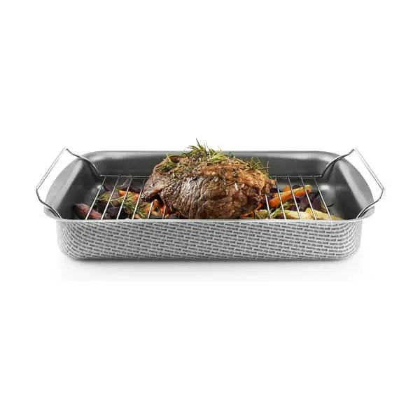 Byd gæsterne på helstegt svinemørbrad med Eva Trios lille bradepande med rist. Mørbraden hviler på risten, så fedt og kødsaft løber fra og bliver opsamlet i bradepanden. På den måde bliver køget stegt, ikke kogt, og du kan bruge saft og fedt til en god sauce. Bradepanden kan du også bruge uden rist, fx til at ovnstege krydrede bøftomater, nye kartofler eller en lille drømmekage. Bradepanden har en indvendig Slip-Let®-belægning, så fedt ikke brænder fast. Tåler opvaskemaskine. Materiale: aluminium. Bredde: 26 cm. Dybde: 19 cm.