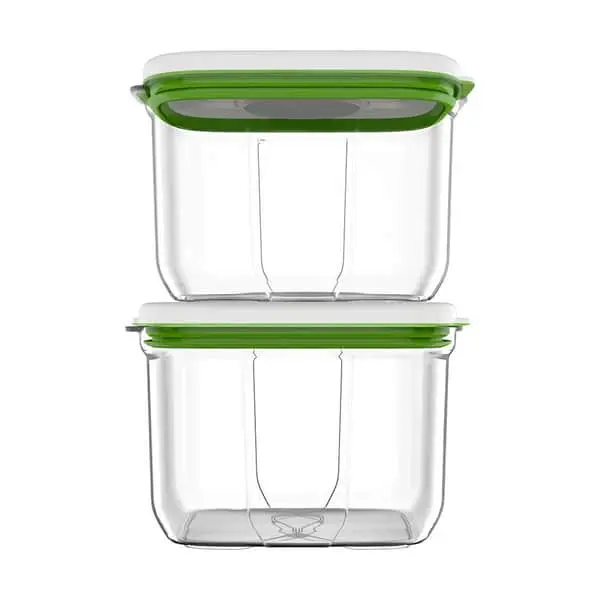 Fyld dine madvarer i en beholder, sæt låget på og placer vakuummotoren på toppen. Tryk på den grønne knap og vent til låget klikker. Nu er luften suget ud, og der er vakuum i beholderen, så du sikkert kan stille dine madvarer i køleskabet. Beholderne kan stables, så du kan skabe orden og få et godt overblik over dine madvarer i køleskabet.