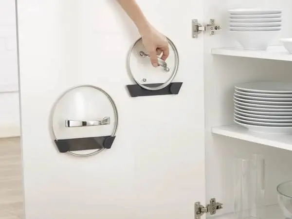 Giver orden i køkkenskabene Passer til grydelåg der måler 16-24 cm Monteres nemt med dobbeltklæbende tape