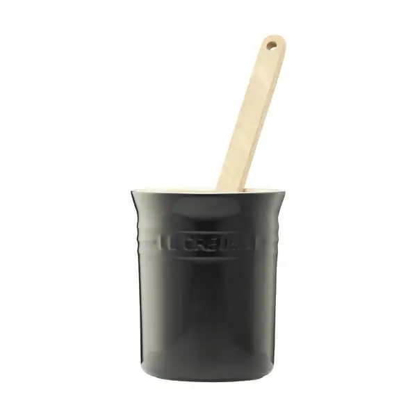Hold styr på grydeskeer og piskeris i køkkenet med den klassiske redskabskrukke i stentøj fra Le Creuset – her i farven sort, som giver et neutralt look til køkkenbordet.