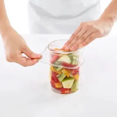 Låget fra Lékué er et rigtig godt alternativ til engangsemballage og madopbevaring af plast, da det er lavet i 100% platinsilikone og kan bruges igen og igen. Den strækbare silikone gør låget fleksibelt, så det slutter tæt om bøtten eller glasset med mad i.Silikonelåget kan også bruges direkte på madvarer, for eksempel som beskyttelse af skærefladen på overskårne meloner, citrusfrugter eller avocado.