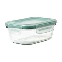 Glasbeholderne har låg med hver fire låseklips og en ekstra tyk pakning, der sikrer 100% tæt forsegling. Beholder og låg er begge BPA-fri, og de forskellige størrelser kan stables i og ovenpå hinanden. Begge dele tåler opvaskemaskine.