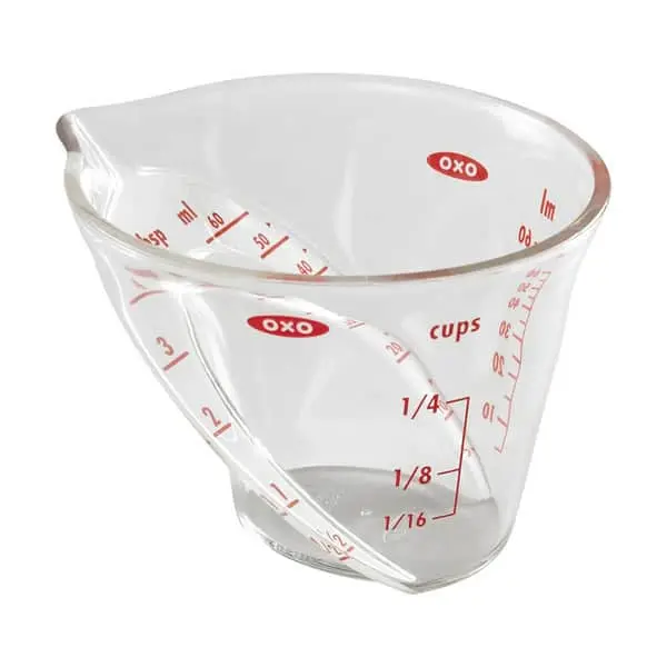 OXO målebægeret er perfekt, når du skal måle små volumer. Det vinklede mål gør, at målene er synlige både fra siden og oppefra, og giver desuden en præcis måling. Det er særligt smart fordi, du kan måle dine ingredienser, imens du hælder dem op i målebægeret uden at skulle holde målebægeret i øjeniveau.