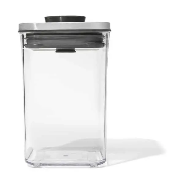 OXO POP Containers er en opbevaringsboks, som er perfekt til opbevaring af madvarer som eksempelvis mel, gryn, cornflakes, pasta, ris og lignende. Lukningen bliver lufttæt ved tryk på den store knap i låget. Knappen fungerer som håndtag, når du skal åbne boksen igen. Så nemt og simpelt.
