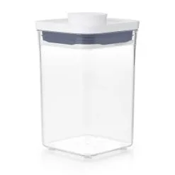 OXO POP Containers er en opbevaringsboks, som er perfekt til opbevaring af madvarer som eksempelvis mel, gryn, cornflakes, pasta, ris og lignende. Lukningen bliver lufttæt ved tryk på den store knap i låget. Knappen fungerer som håndtag, når du skal åbne boksen igen. Så nemt og simpelt.