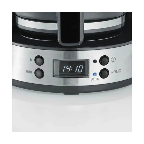 Kaffemaskinen har andre smarte funktioner, såsom et digitalt ur med timer, så du nemt kan indstille kaffemaskinen til at starte kaffebrygningen. Kaffemaskinens integrerede varmeplade med hold-varm-funktion sikrer, at du altid har varm kaffe på kanden – perfekt, hvis kaffetørsten skulle komme tilbage efter den første kop.