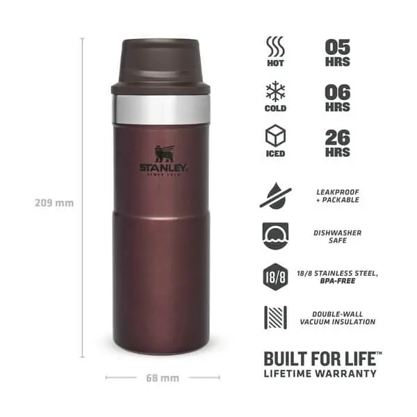 Denne termokop er en del af Stanleys Classic Series. Her finder du holdbare produkter, der er skabt til dig, der vil have godt kram med dig, når du er udendørs, på farten eller dyrker sport. Termokoppen her holder væsker varme i op til 5 timer, kolde væsker kolde i op til 6 timer og iskolde væsker iskolde i på til hele 26 timer.
