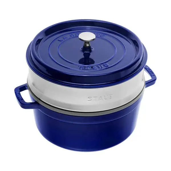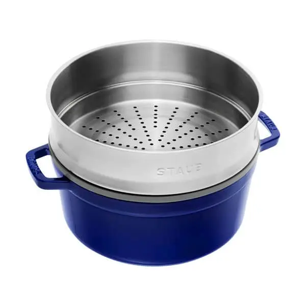 Klassisk støbejernscocotte fra Staub med tilhørende dampindsats i stål. Cocotten blev udviklet i Frankrig til tilberedning af velsmagende gryderetter, fordi dens støbejernskonstruktion holder særdeles godt på varmen og frigiver den langsomt til maden.