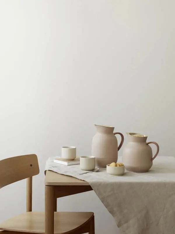 Amphora er navnet på termokanden, og både navnet og formen er inspireret af de oldgræske lerkrukker. Du ved dem der blev brugt til at opbevare olie og vin i. Kanden har en rund form, der er lidt bredere i toppen, ligesom lerkrukker også har den runde krop med de brede skuldre.